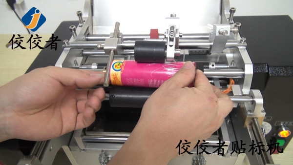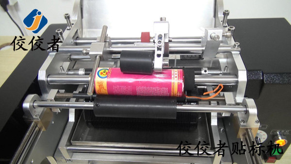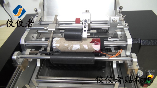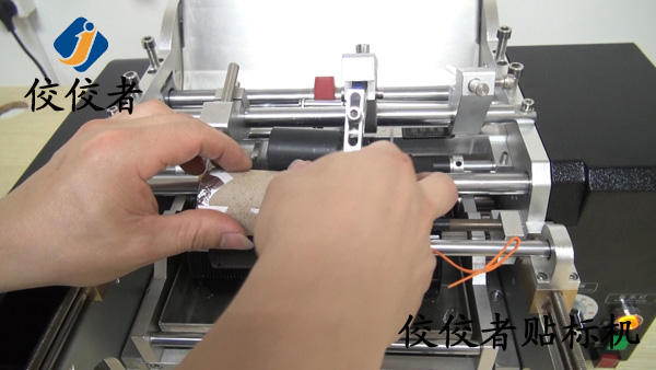 將產(chǎn)品放入到貼標(biāo)機(jī)上放產(chǎn)品的位置,這里可根據(jù)產(chǎn)品直徑大小和長短來調(diào)整這個間隔,讓產(chǎn)品放上去平穩(wěn),然后踩腳踏開關(guān),標(biāo)簽出標(biāo)貼標(biāo)覆標(biāo),如下圖:
