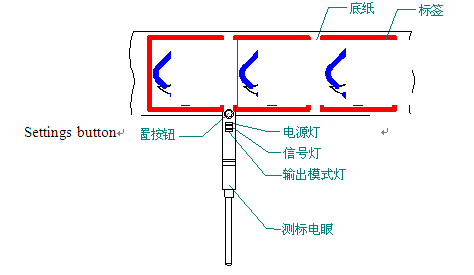 二、將有標簽的地方置于電眼的槽里面,持續按住調整按鈕3秒鐘左右,可以看到電眼的黃色信號燈閃爍,然后松開按鈕,將沒有標簽的地方(只有標簽的底紙)置于電眼槽內,持續按住調整按鈕8秒鐘,然后松開按鈕,此時,設置完成。