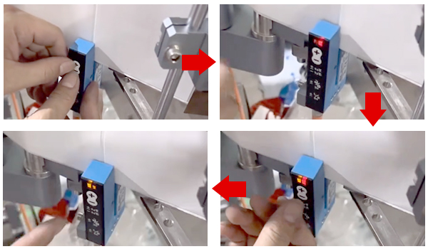 2)將有標簽的地方置于電眼的U 型槽內,此時按一下正號和負號,燈閃紅光;
