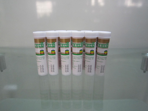 上圖是農藥瓶貼標機對藥品瓶潤喉片進行貼標后的樣品圖片。