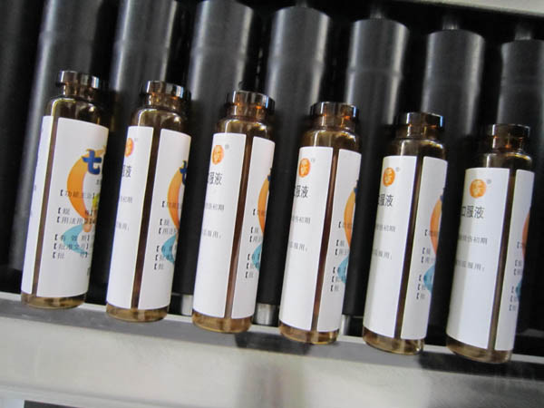 上圖是口服液瓶在口服液貼標機上貼標時的圖片。