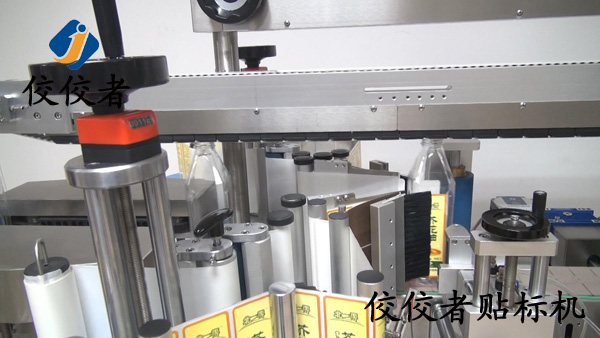 芥花油瓶貼標機使用方式非常簡單,首先先將兩卷標簽按照說明書上面的繞標指導方式安裝在料盤,設置好標簽電眼和測物電眼。然后調整設備的各個結構來匹配產品,這方面的操作都是通過觸摸屏來操作的,需要根據產品的外形來調整壓頂的高度、兩個標頭的相對位置。整個操作和調試對使用人員沒有文化或者其他方面的特殊要求,任何人都可以使用。設備調整好后放上產品就可以輕松、高效的將正背標貼在產品需要的位置。如下圖: